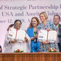 La Amrita Vishwa Vidyapeetham y la Universidad de Arizona se han embarcado en una asociación multidisciplinar en educación e investigación. Se trata de una de las mayores colaboraciones universitarias internacionales en la India. Amma, canciller de la Amrita Vishwa Vidyapeetham, y la Dra. Liesl Folks, rectora y vicepresidenta de asuntos académicos de la Universidad de Arizona, firmaron el convenio de colaboración.