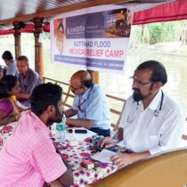 16 de agosto de 2018. Equipos médicos desplazados desde el Hospital Amrita están trabajando para ofrecer tratamientos en áreas remotas afectadas por las inundaciones de Kerala. Estos lugares tienen actualmente limitado el acceso a las instalaciones de atención médica y, en algunos casos se ha tenido que ofrecer el servicio médico en embarcaciones debido a las extensas inundaciones. Hasta el momento, han perecido 67 personas a causa de las inundaciones y alrededor de 150.000 personas se han visto desplazadas de sus hogares.