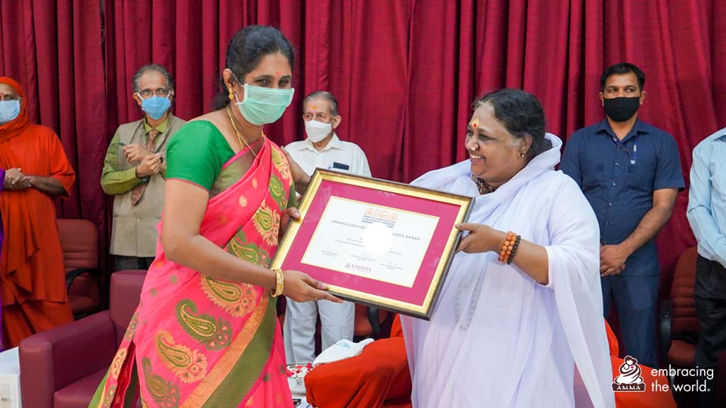 En su discurso, Amma dijo: “Los esfuerzos de mis hijos desde la creación de la universidad han dado como resultado proyectos que han ayudado enormemente a los estratos más bajos de nuestra sociedad. Estos premios son un símbolo de esa felicidad.